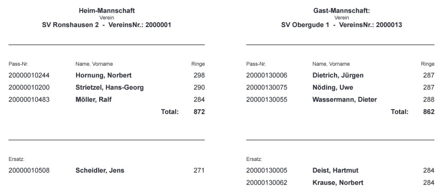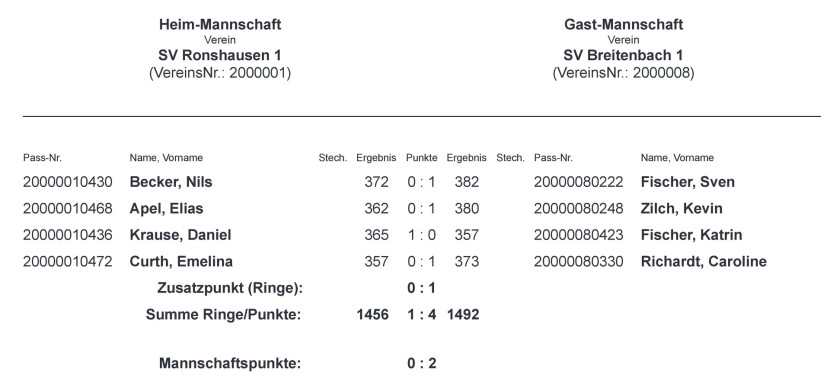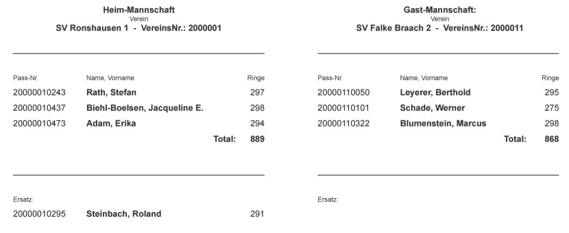 Die 2. Mannschaft vom SV "Falke" Braach hatte gegen die starken Ronshäuser keine Chance und somit blieben die ersten beiden Mannschaftspunkte in Ronshausen. Die beste im Ronshäuser Team war Jacqueline Biehl-Boelsen mit 298 Ringen. Ebenfalls starke Ergebnisse lieferten Stefan Rath mit 297 Ringen und Erika Adam mit 294 Ringen ab und vervollständigten hiermit die tolle Mannschaftsleistung. Nicht in der Wertung war Roland Steinbach mit 291 Ringen.