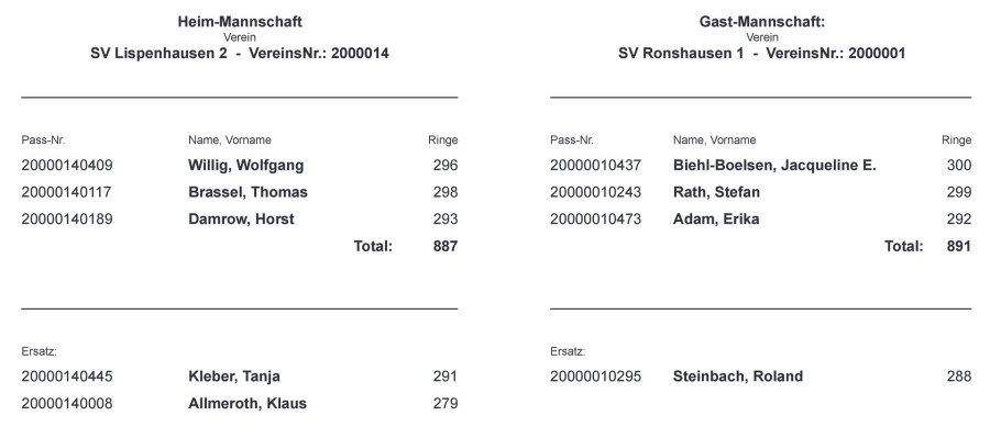 Die 1. Mannschaft Senioren besiegt völlig überraschend den Tabellenführer SV Hirsch Lispenhausen in der Grundklasse 1 mit Vereinsrekord. Gleichzeitig egalisiert der SV Tell Ronshausen den geschossenen Saisonrekord von den Lispenhäusern mit 891 Ringen. Beste im Team der Ronshäuser war Jacqueline Biehl-Boelsen mit 300 Ringen. Für Jacqueline war dieses Ergebnis persönliche Bestleistung. Ebenfalls in Topform zeigte sich Mannschaftsführer Stefan Rath mit geschossenen 299 Ringen. Für Ihn war sein geschossenes Ergebnis ebenfalls persönliche Bestleistung. Das herausragende Mannschaftsergebnis vervollständigte Erika Adam mit
